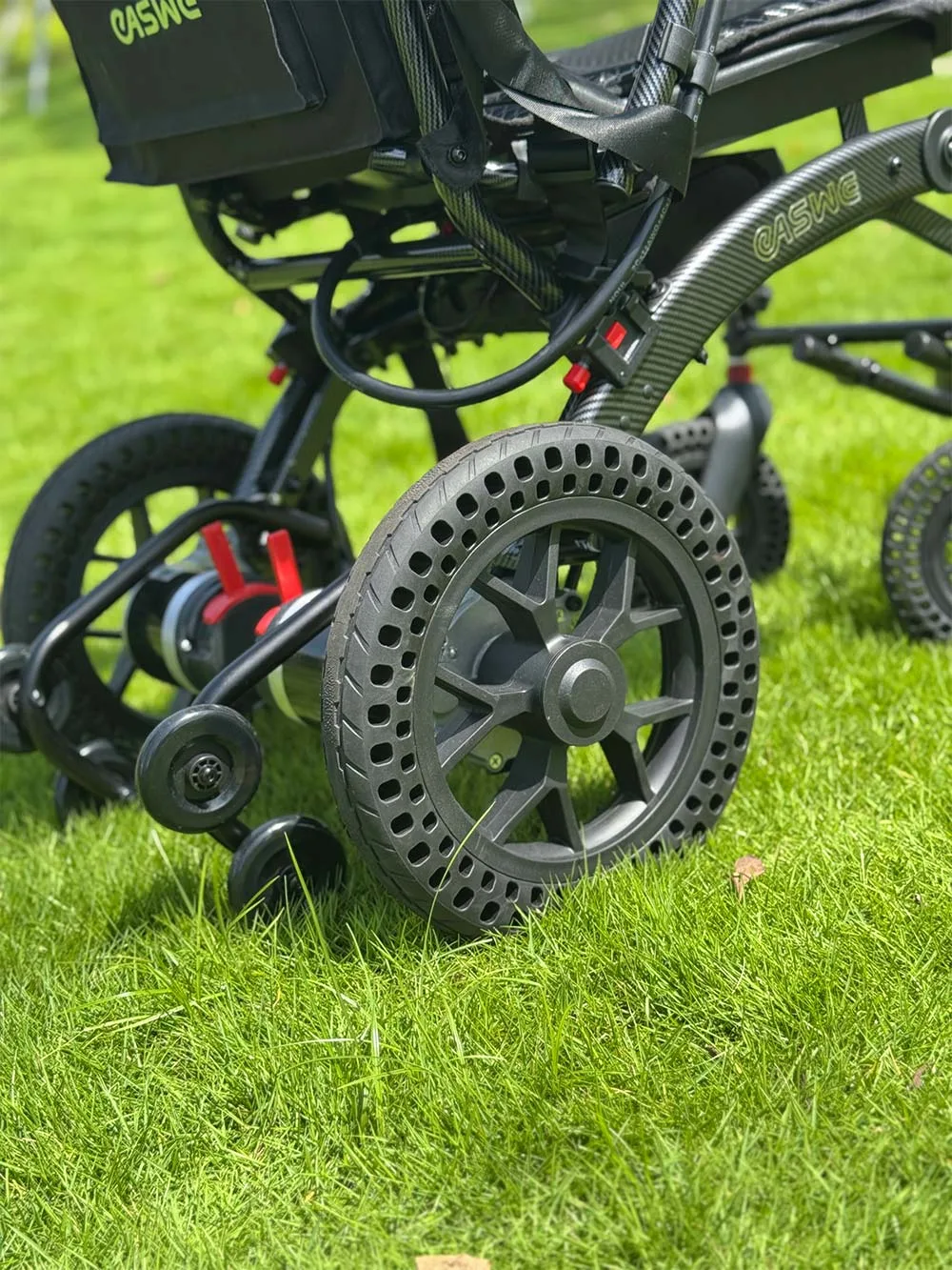 Våra elektriska rullstolar har honeycomb-däck både fram och bak, vilket gör dem lämpliga för både inomhus- och utomhusbruk.