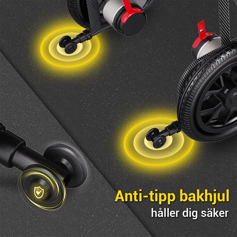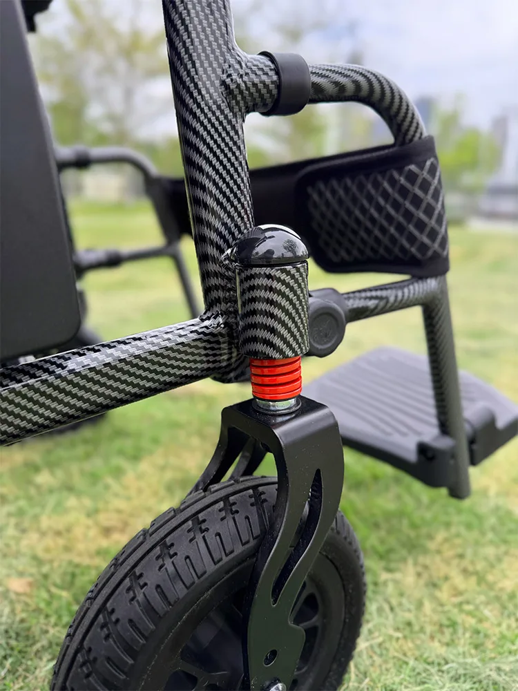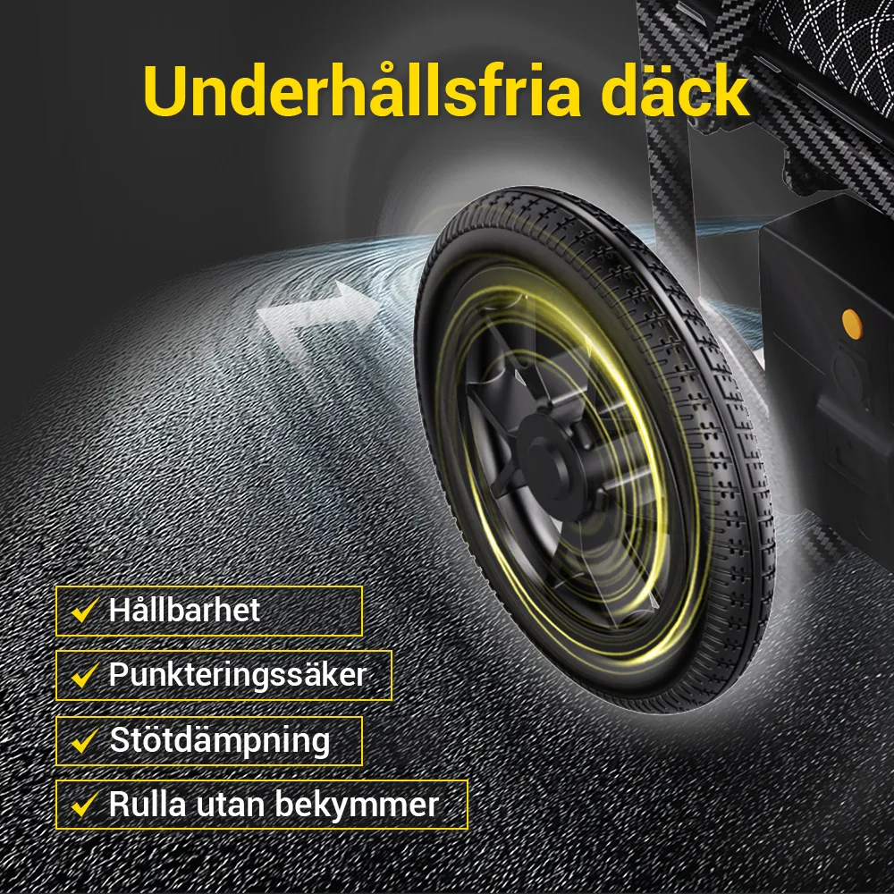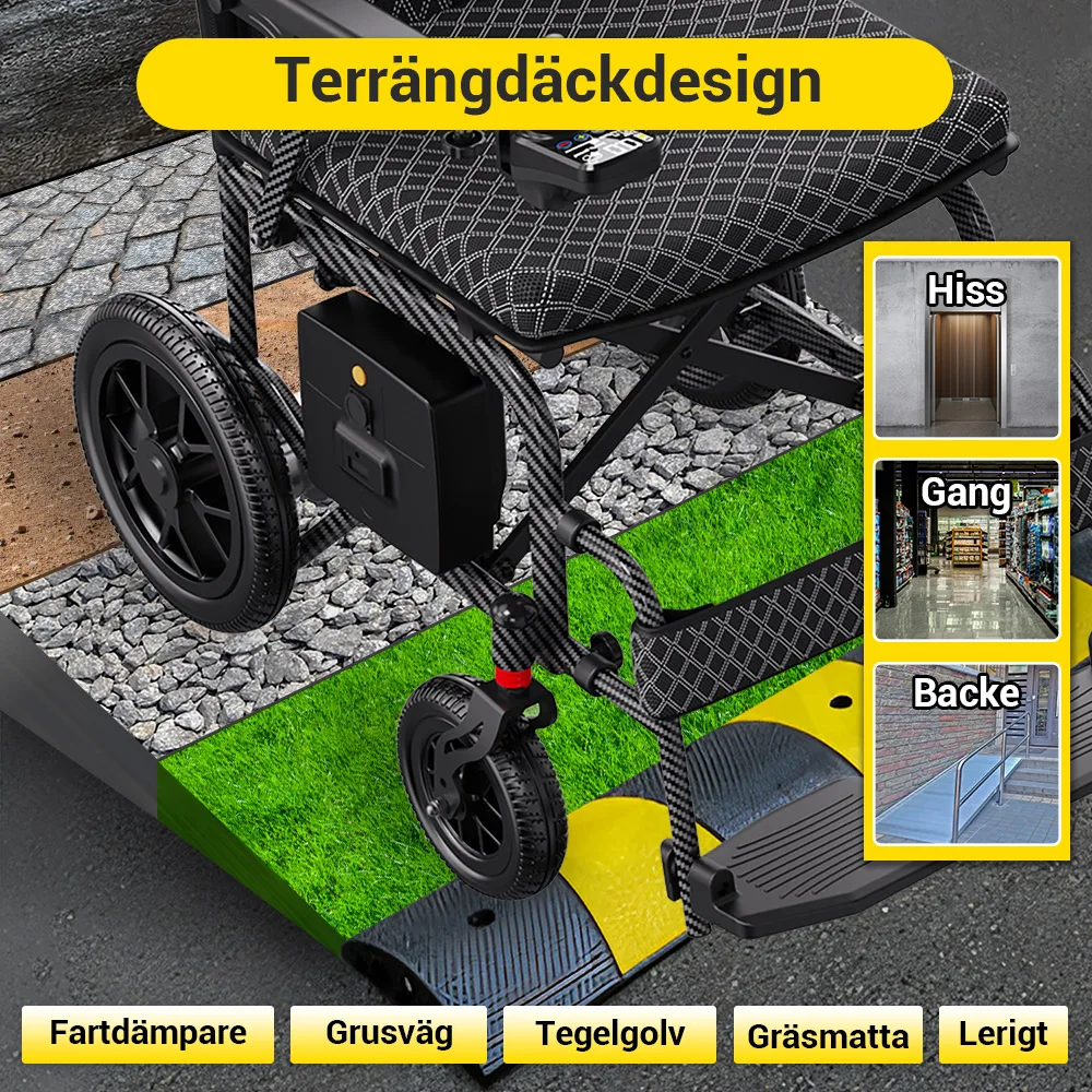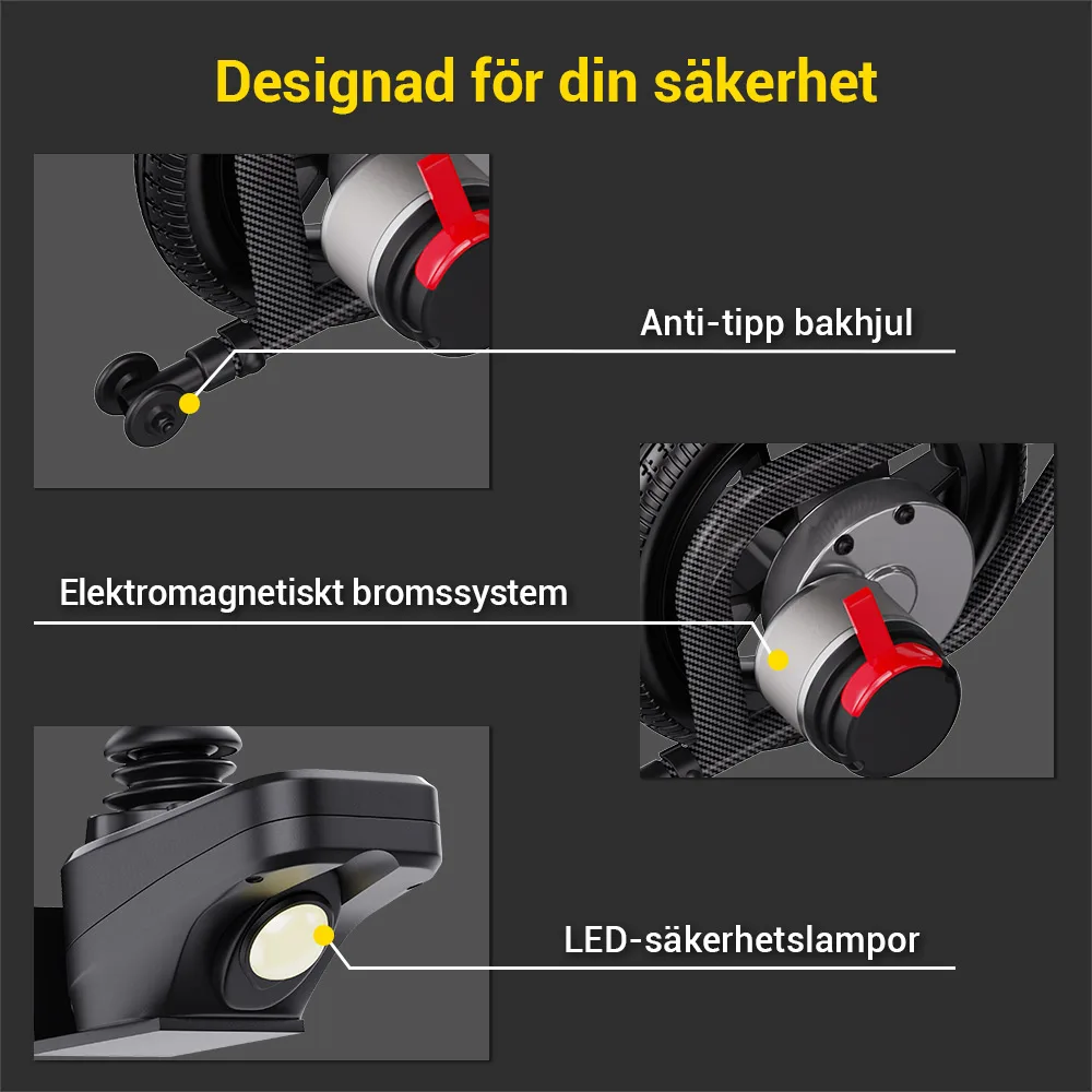 - Komfort-först design: Stötdämpande fjädringssystem i både sits och framhjul säkerställer överlägsen komfort och stöd, även på ojämna ytor.